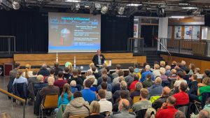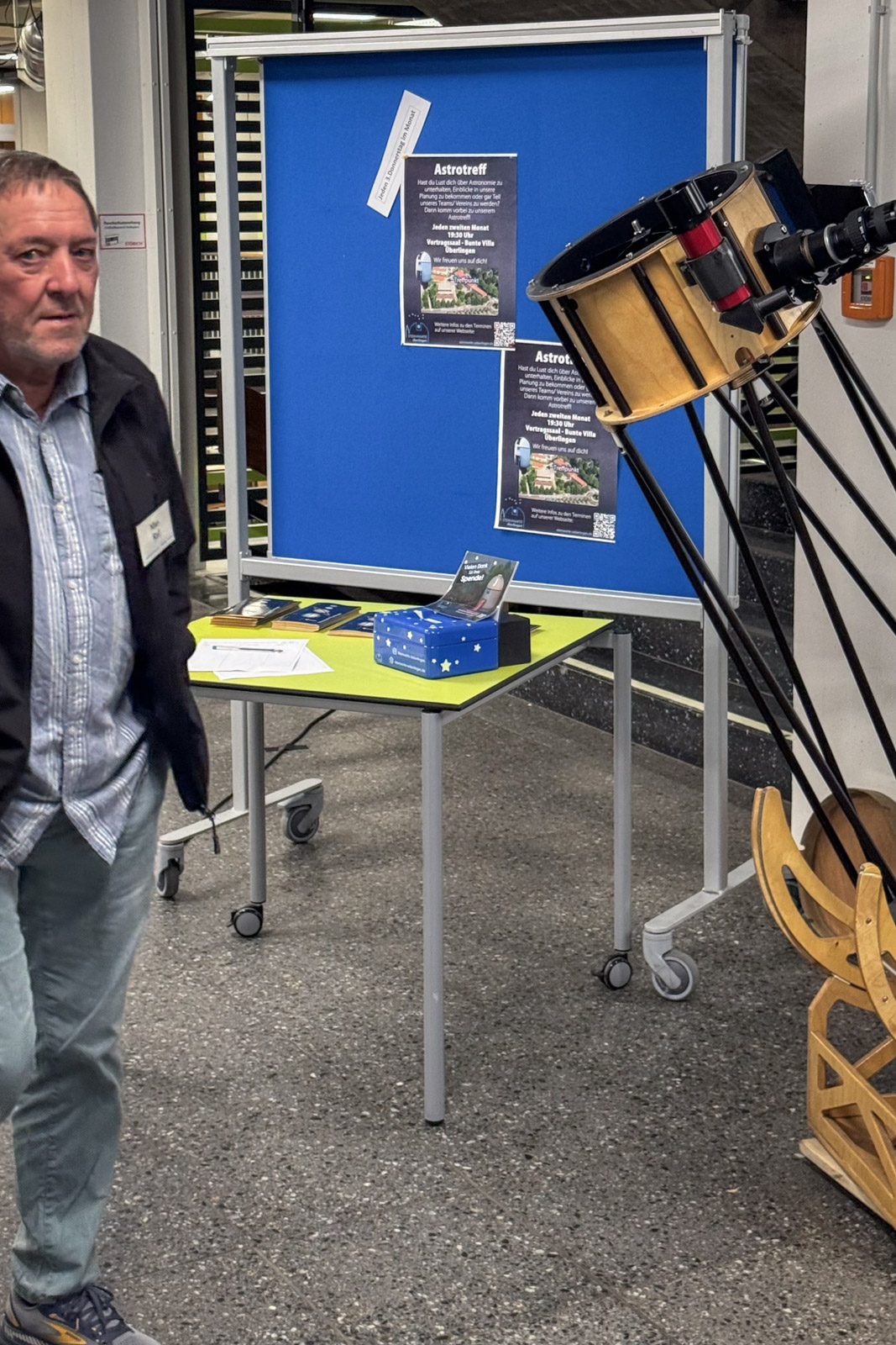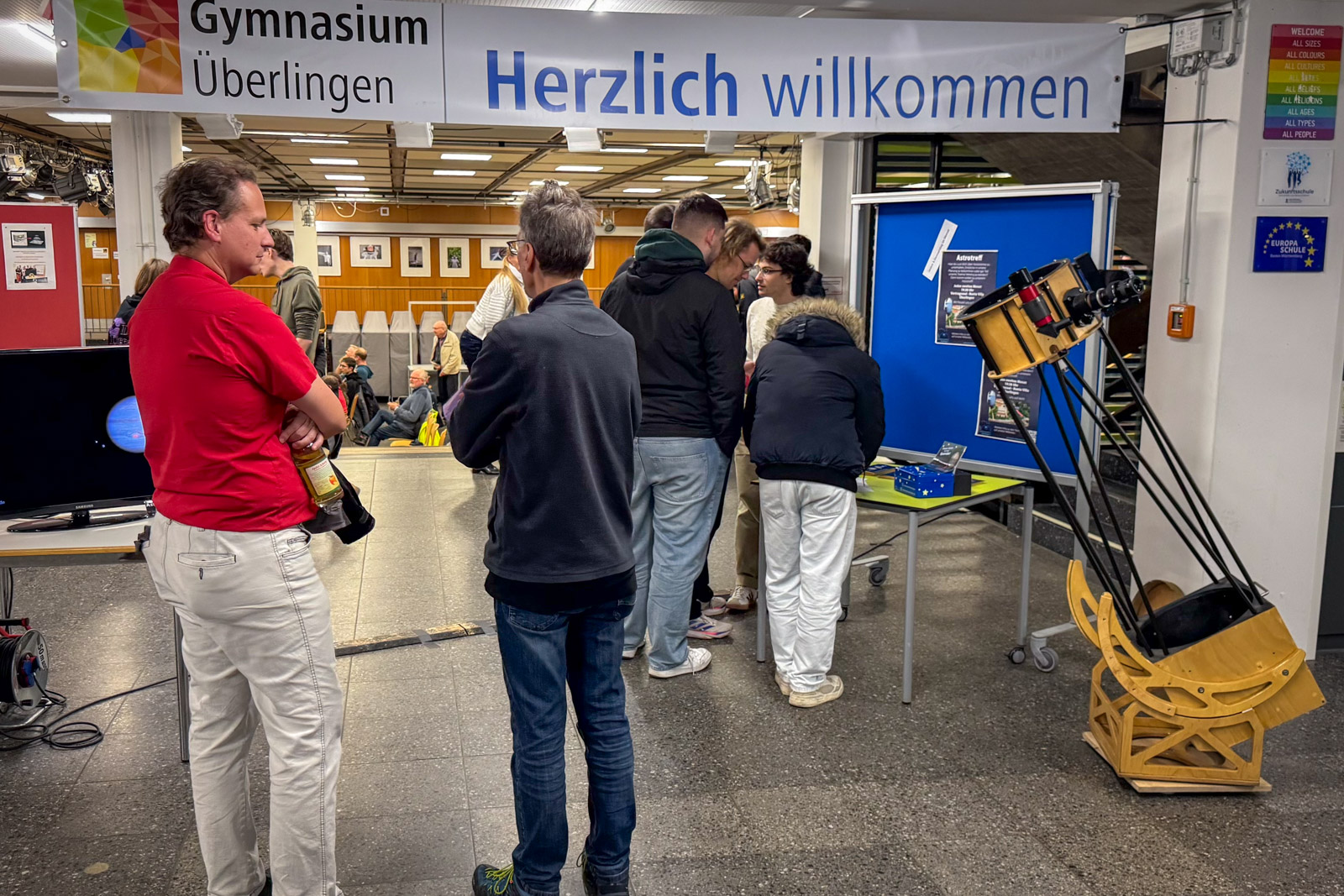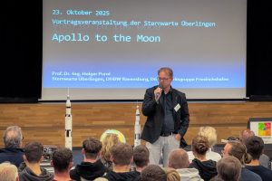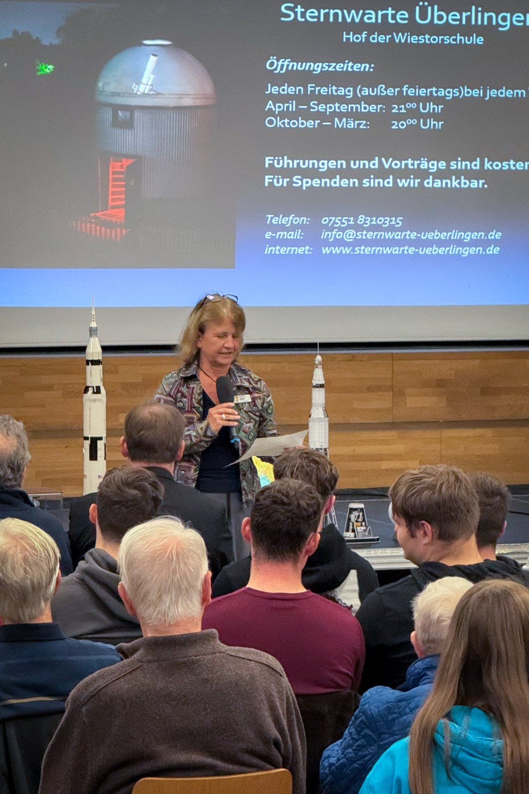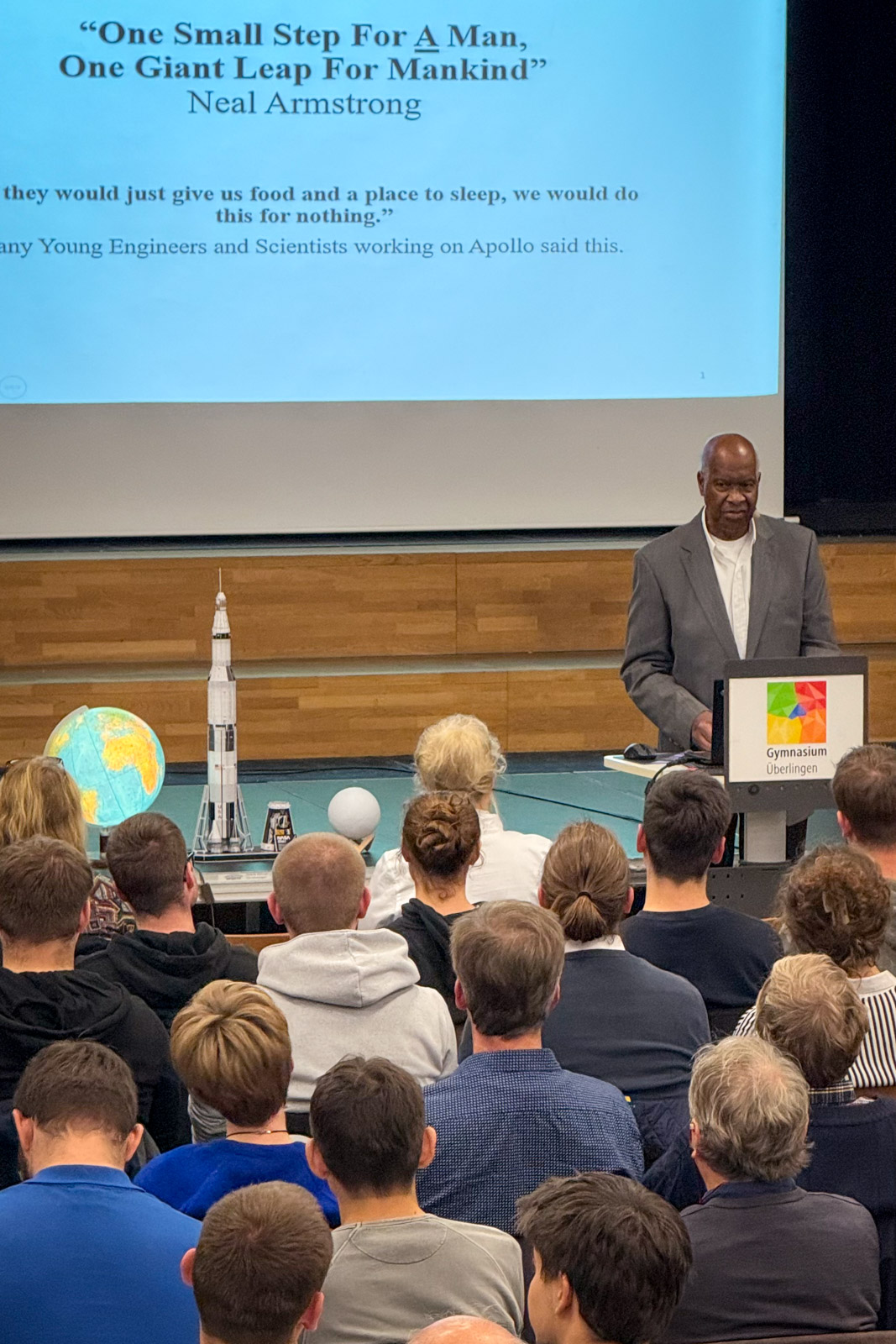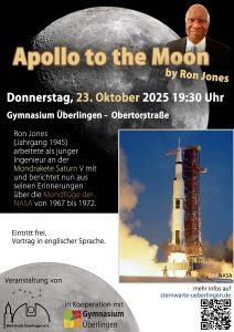 In der voll besetzten Aula des Gymnasiums Überlingen berichtete Ron Jones auf Einladung der Sternwarte am 23. Oktober 2025 über seine Mitarbeit am Apollo Projekt der NASA, das zwischen 1969 und 1972 zu 6 erfolgreichen Landungen auf dem Mond führte. Ron Jones (Jahrgang 1945) arbeitete als junger Ingenieur an der Steuerungs- und Speichertechnik der Saturn V Rakete.