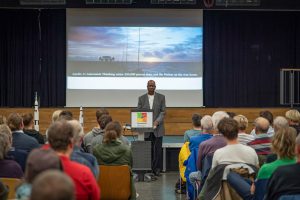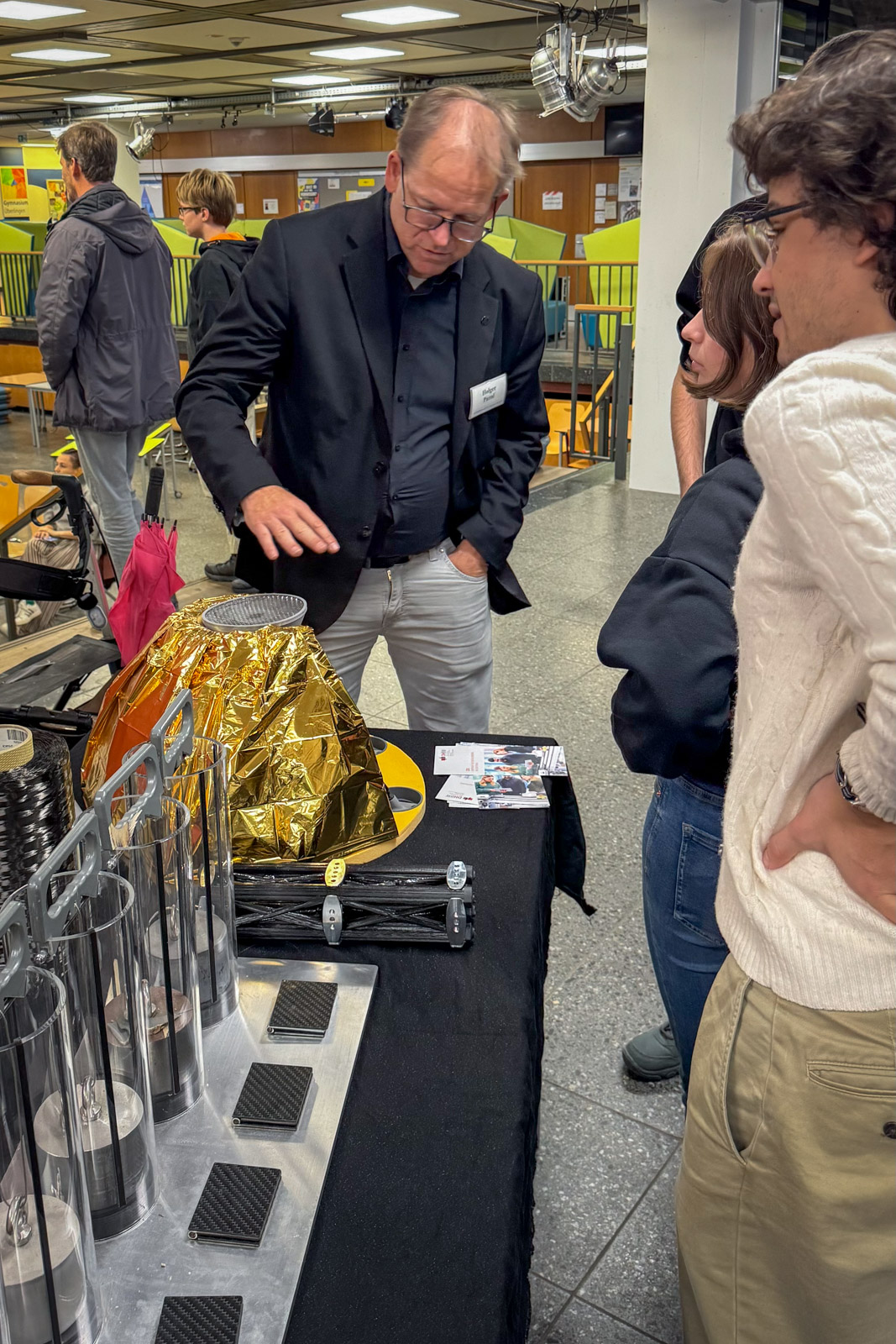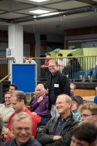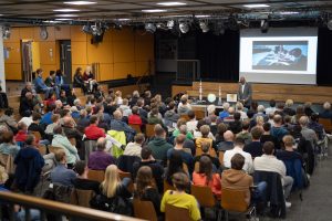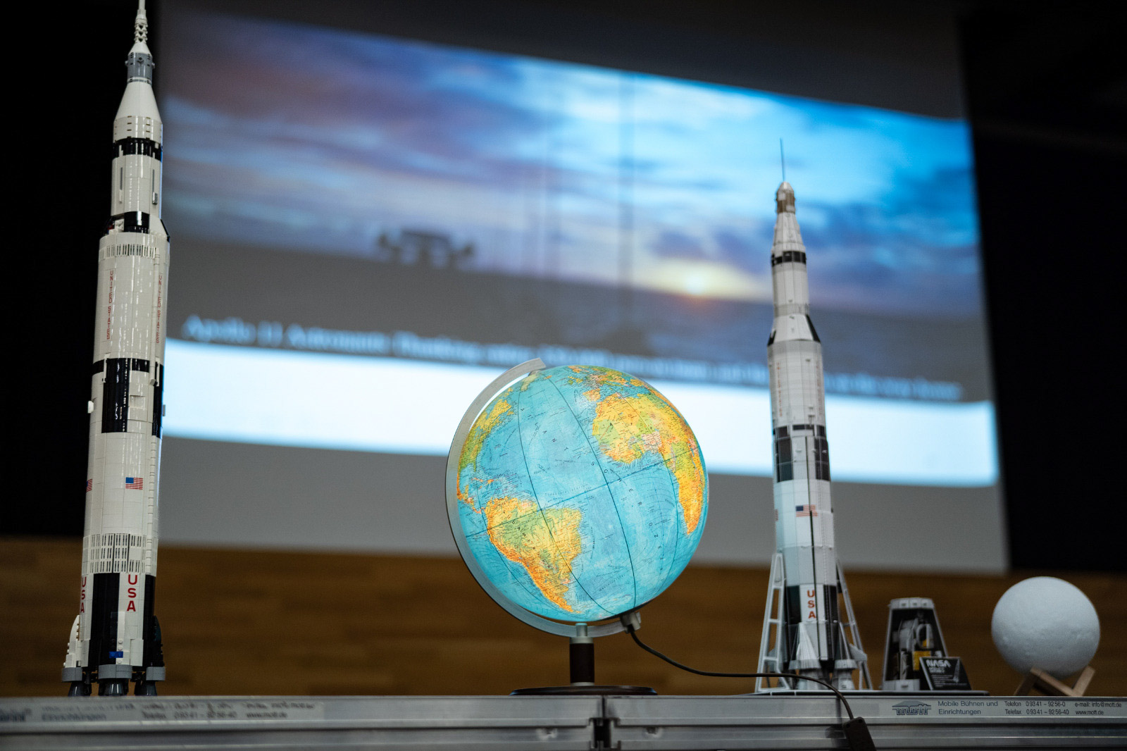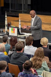 Sein Vortrag beleuchtete die Entwicklung des Raumprogramms der NASA vom „Sputnikschock“ 1957, über die Ankündigung von Präsident Kennedy 1961, bis zu Ende des Jahrzehnts Menschen zum Mond und sicher zurück zu bringen, bis zum erfolgreichen Flug von Apollo 11 im Jahre 1969.