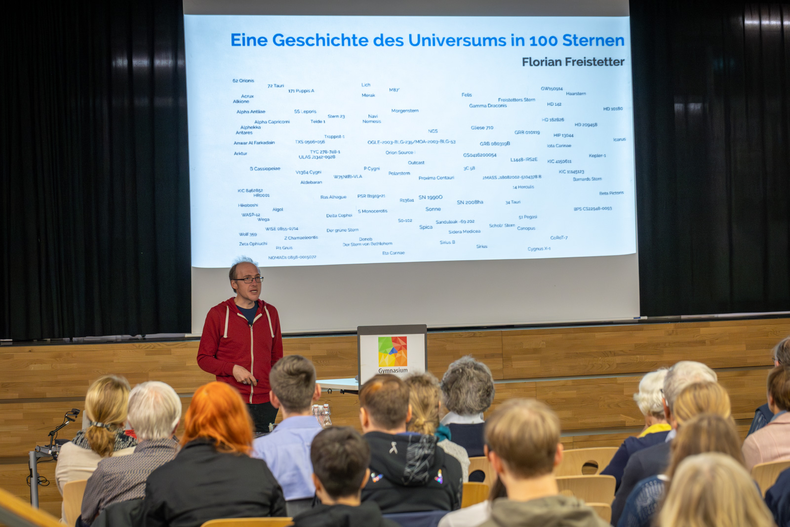 Am Donnerstag den 26. Oktober 2023 konnten wir Dr. Florian Freistetter zu seinem lebhaften Vortrag „Eine Geschichte des Universums in 100 Sternen“ im Forum des Gymnasiums Überlingen begrüßen. Freistetter, der Astronomie an der Universität Wien studiert hat, gilt im deutschsprachigen Raum als einer der bekanntesten Wissenschaftsblogger und Podcaster der Astronomie. Wir durften also erwarten, dass viele Interessierte der Einladung folgen würden, so dass der übliche Vortragsraum kaum ausreichen dürfte.